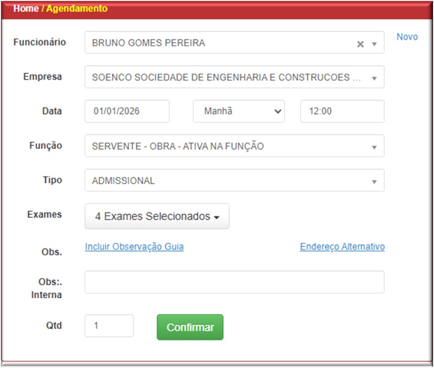 O agendamento pode ser feito diretamente pela plataforma, incluindo data, turno e exames selecionados de forma automática.