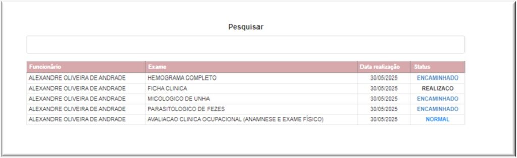 É possível vizualizar o histórico dos exames, com data de realização e status.
