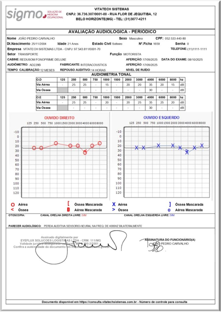 Audiometria gerada diretamente pelo sistema com assinatura digital.